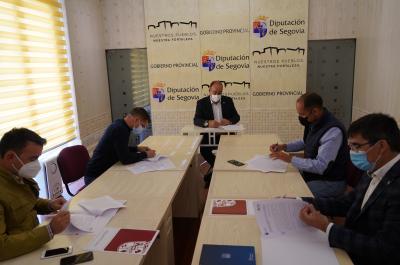 El presidente de la Diputación de Segovia, Miguel Ángel de Vicente, y los alcaldes de Cantalejo, Cuéllar, el Real Sitio de San Ildefonso y Prádena, municipios en los que están ubicados los cuatro CEAAS de la provincia, han procedido esta mañana a la firma de los convenios que, cada año, renuevan el compromiso de la institución provincial con los consistorios de contribuir a la cobertura de los gastos de los edificios municipales que albergan los Centros Agrupados de Acción Social.
