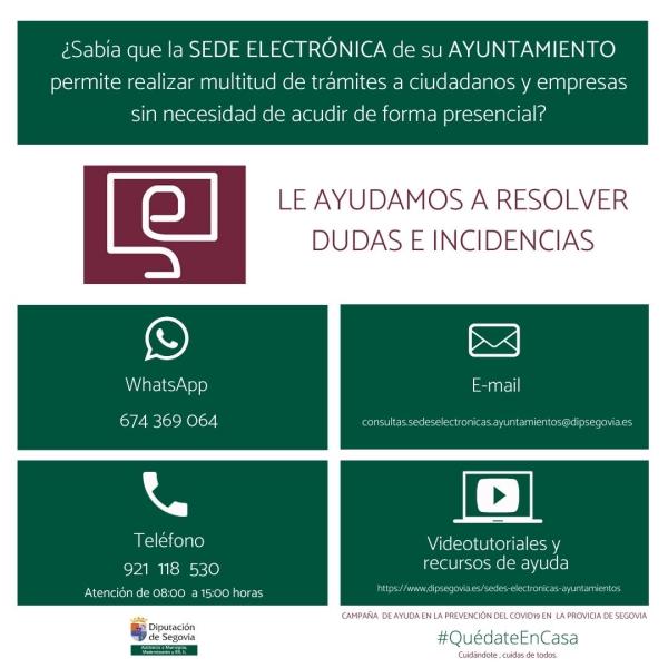De este modo, el Servicio que dirige la vicepresidenta segunda de la Diputación, Sara Dueñas, ha habilitado un número de teléfono (921 118 530), una dirección de correo electrónico (consultas.sedeselectronicas.ayuntamientos@dipsegovia.es), un número de WhatsApp (674 369 064) y una plataforma (https://www.dipsegovia.es/sedes-electronicas-ayuntamientos) de videotutoriales y recursos de ayuda que se mantendrán activos durante el tiempo en que esté vigente el Estado de Alarma. "Con esta iniciativa ponemos a disposición de los ayuntamientos una serie de herramientas destinadas a ofrecer a sus ciudadanos todas las facilidades para realizar sus trámites desde su ordenador, móvil o tablet", afirma Sara Dueñas, quien asegura que "las Sedes Electrónicas suponen un sistema fácil y ágil que, además, está disponible las veinticuatro horas del día y que permite a todo el mundo cumplir con la responsabilidad social actual de quedarse en casa".